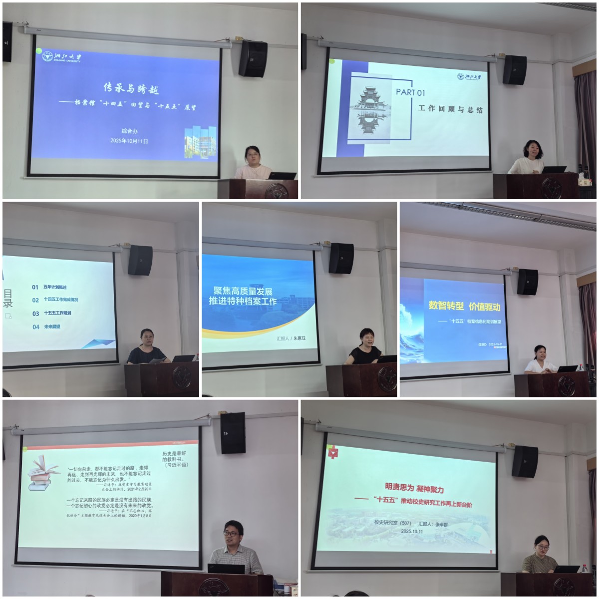 会议围绕“聚焦使命 高质量谋划档案事业‘十五五’发展”主题,深入思考和探讨学校档案工作“十五五”高质量发展举措。综合办公室主任刘新作《“传承与跨越——档案馆“十四五”回望与“十五五”展望》报告,收集指导办公室主任胡岚作《总结过往路 开启新征程 高质量谋划档案事业“十五五”发展》报告,保管利用办公室主任沈颖婕作《谋深谋实 继往开来——保管办十五五发展规划》报告,特种档案办公室主任朱惠珏作《聚焦高质量发展,推进特种档案工作》报告,信息开发办公室主任傅天珍作《数智转型 价值驱动——“十五五”档案信息化规划展望》,编研展览办公室主任张淑锵作《功在不舍:编研室“十五五”设想》,校史研究室主任张卓群作《明责思为 凝神聚力——“十五五”推动校史研究工作再上新台阶》报告。