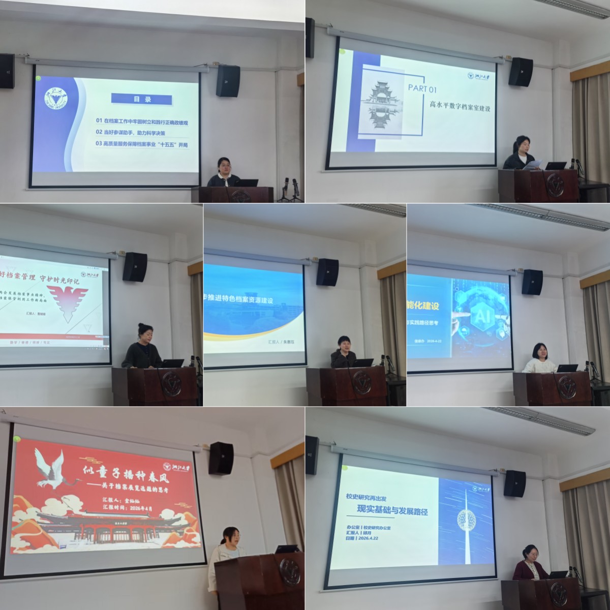 综合办公室主任刘新作“以高质量综合服务助力学校档案事业‘十五五’开新局”专题发言,收集指导办公室副主任毛文婷作“档案工作数智化转型方向与路径探讨”专题发言,保管利用办公室副主任曹媛媛作“贯彻两会发展档案事业精神 开创档案保管利用工作新局面”专题发言,特种档案办公室主任朱惠珏作“稳步推进特色档案资源建设”专题发言,信息开发办公室主任傅天珍作“档案智能化建设——AI赋能与实践路径思考”专题发言,编研展览办公室副主任金灿灿作“似童子播种春风——关于档案展览选题的思考”专题发言,校史研究室副主任邱月作“校史研究再出发——现实基础与发展路径”专题发言。